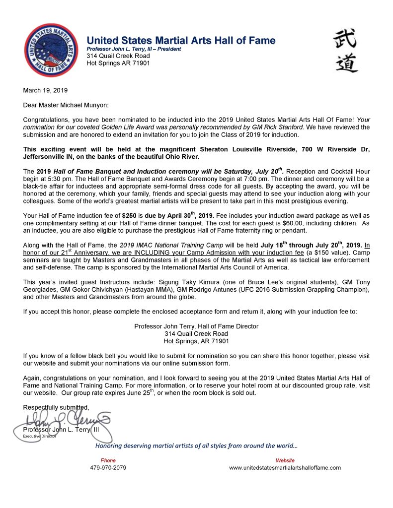 Dear Master Michael Munyon: Congratulations! This is to inform you that you have been nominated for induction into the 2018 United States Kido Federation Black Belt Hall of Fame and Excellence Awards, which will be held on April 21, 2018 Read More …